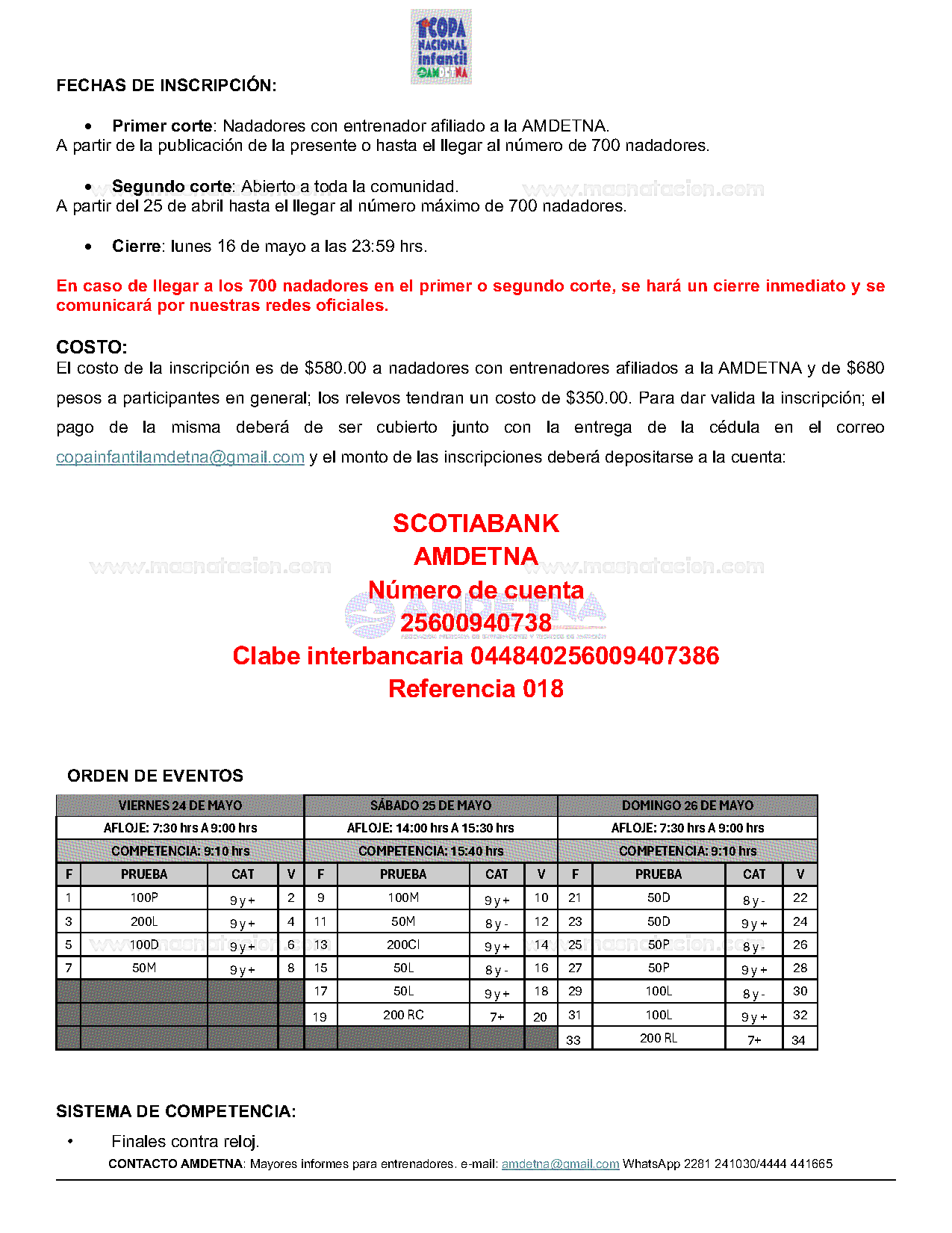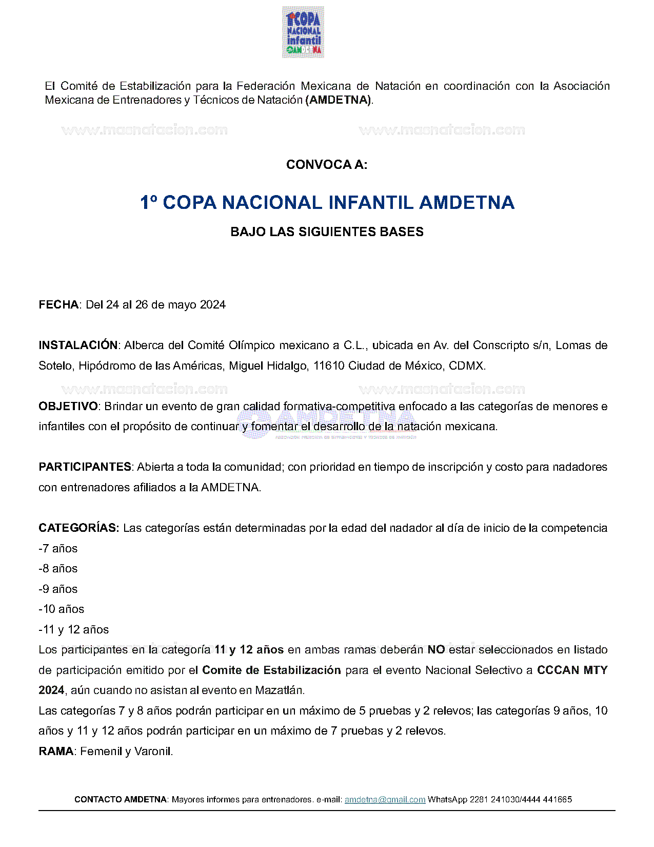 1ª Copa Nacional Infantil Amdetna 2024 Alberca del Comité Olímpico, Ciudad de México, México 24 de mayo del 2024 Convocatoria Resultados