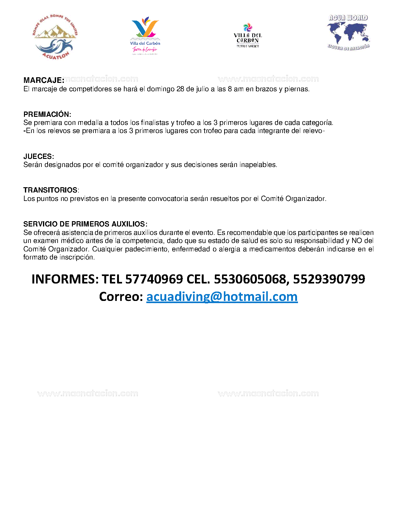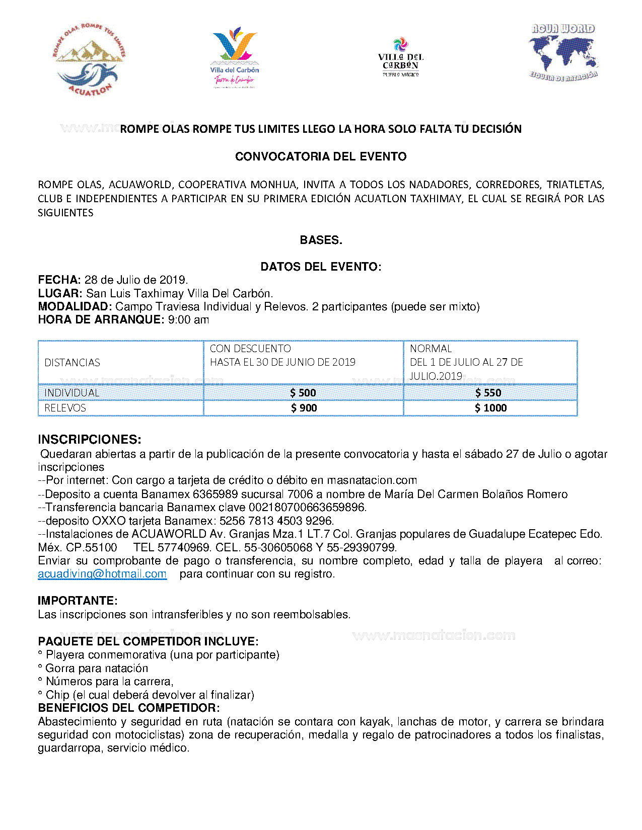 ROMPE OLAS, ACUAWORLD, COOPERATIVA MONHUA, INVITA A TODOS LOS NADADORES, CORREDORES, TRIATLETAS, CLUB E INDEPENDIENTES A PARTICIPAR EN SU PRIMERA EDICIÓN ACUATLON TAXHIMAY, EL CUAL SE REGIRÁ POR LAS SIGUIENTES