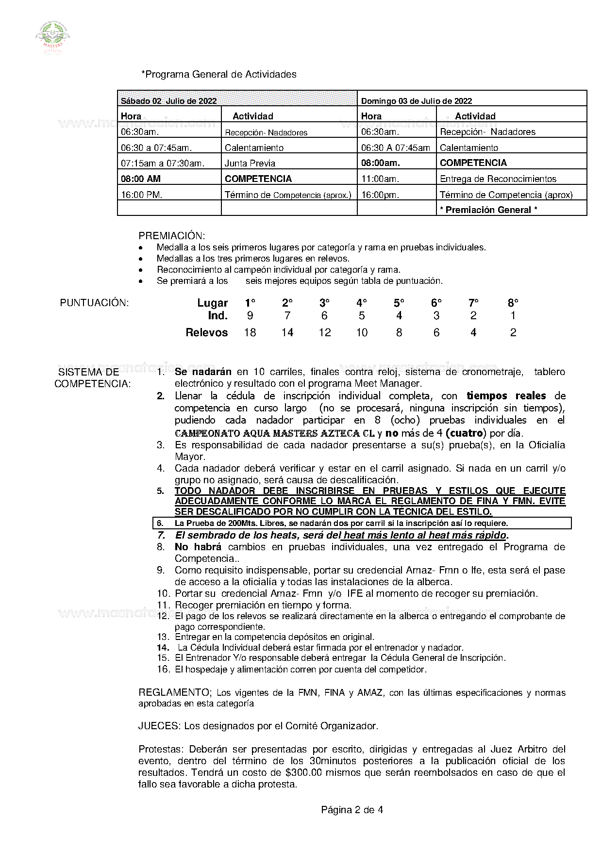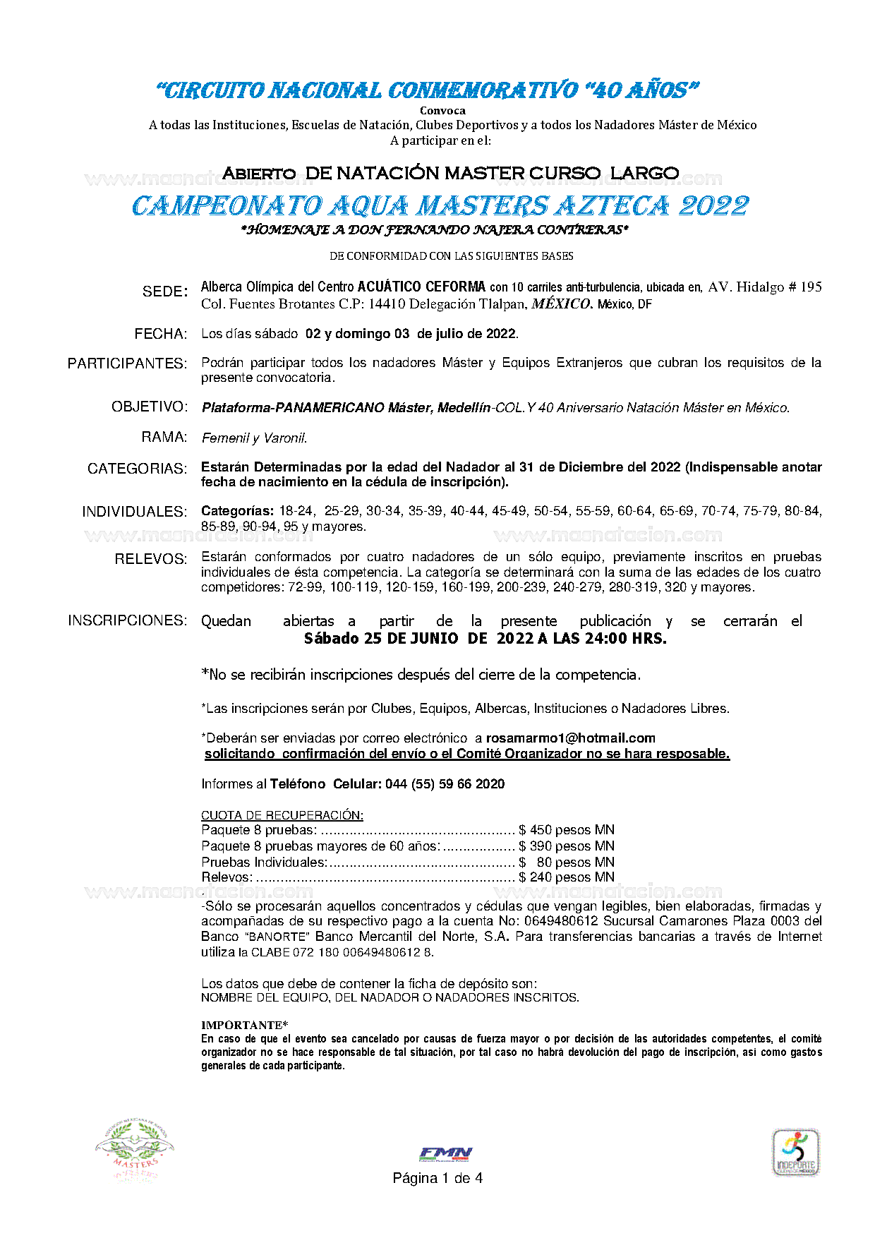 Campeonato Aqua Masters Azteca 2022 Centro Acuático Ceforma, Ciudad de México, México 2 de julio del 2022 Convocatoria Resultados