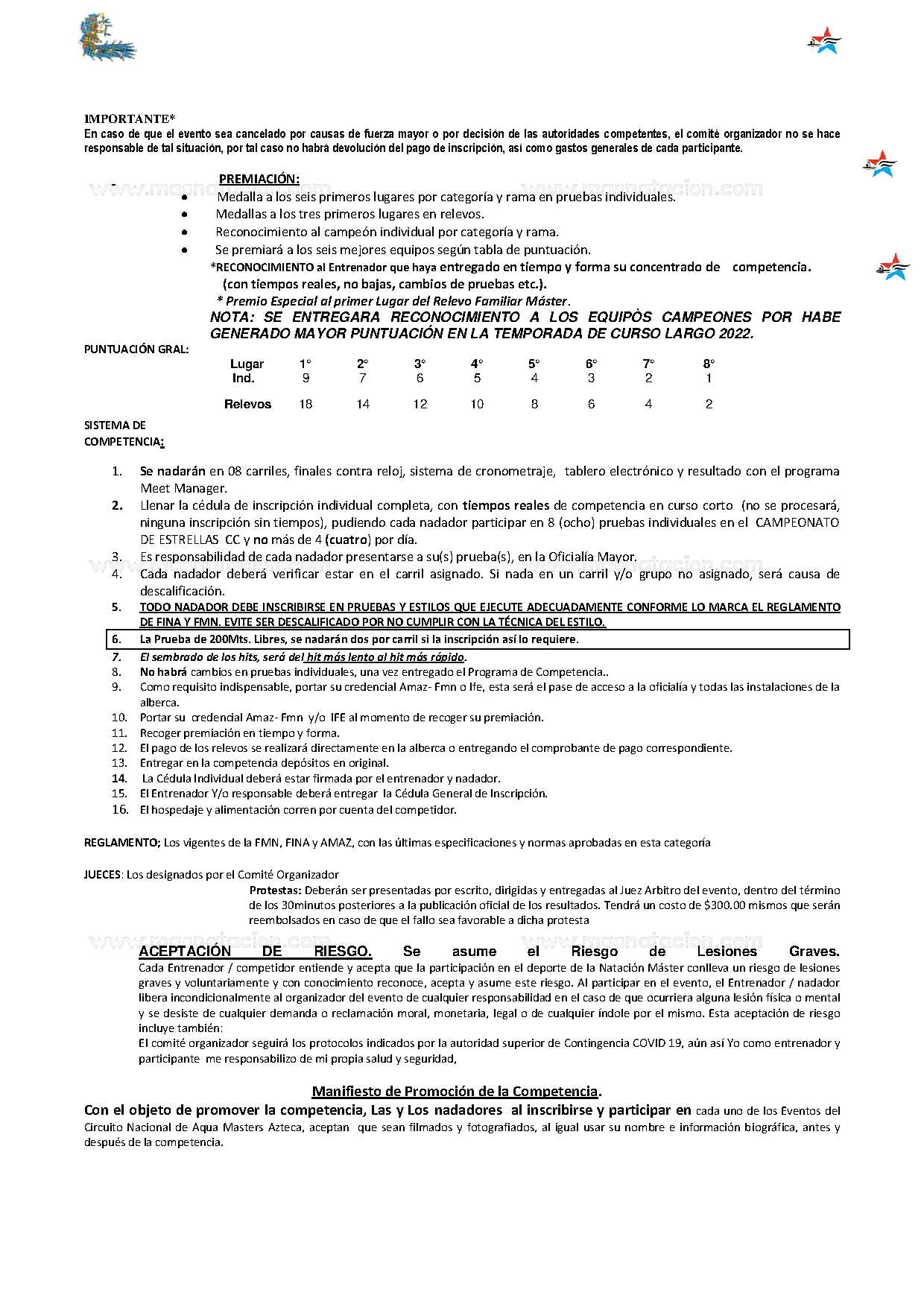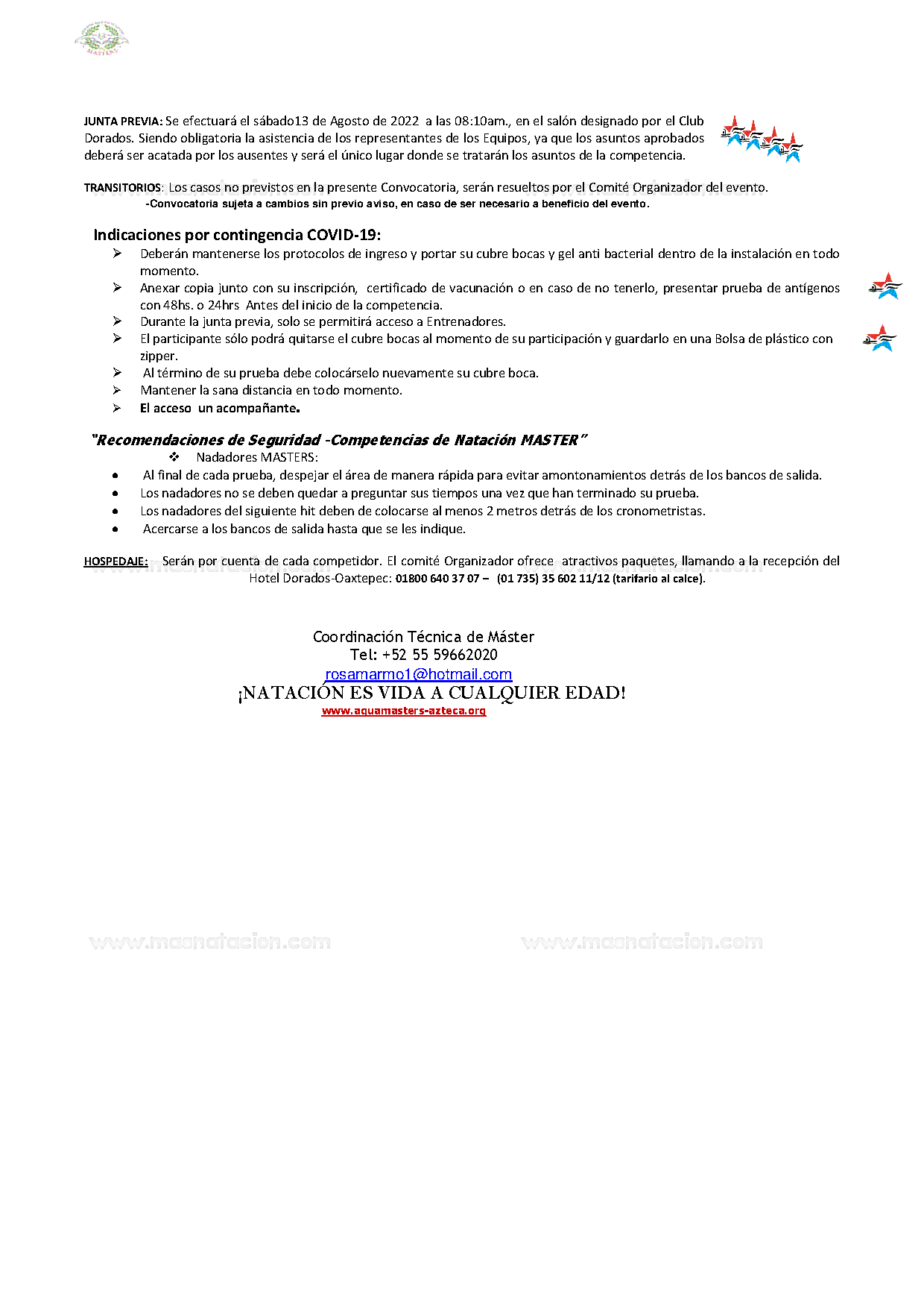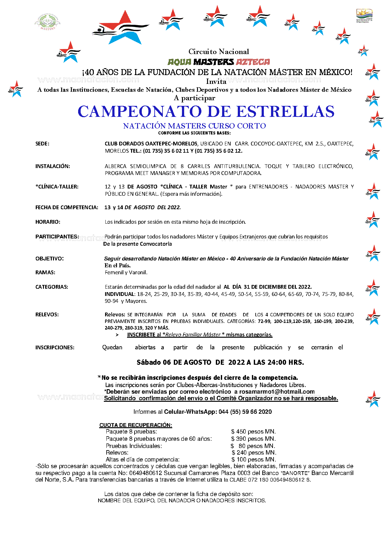 Campeonato de Estrellas Natación Masters Curso Corto 2022 Club Dorados Oaxtepec-Morelos, Morelos, México 12 de agosto del 2022 Convocatoria Resultados