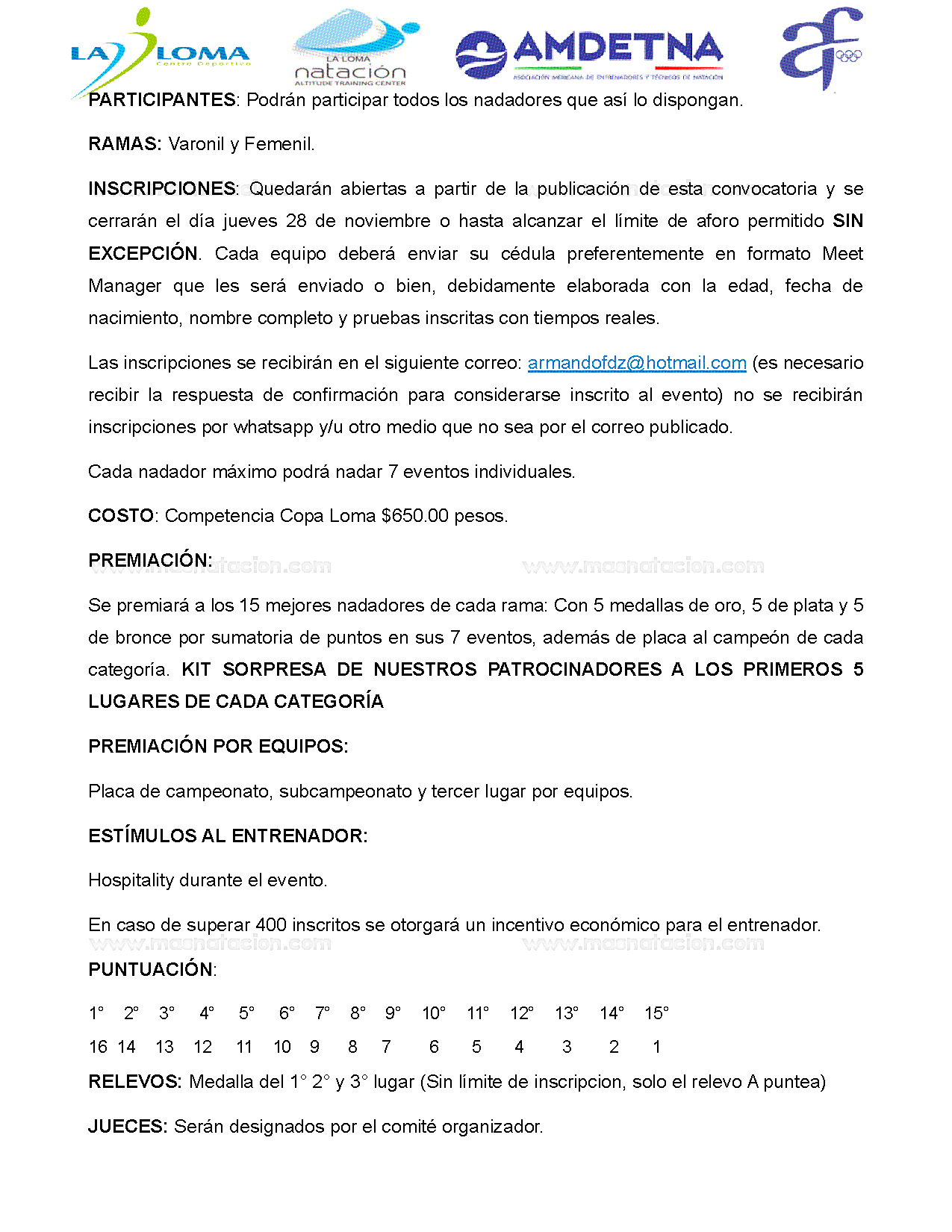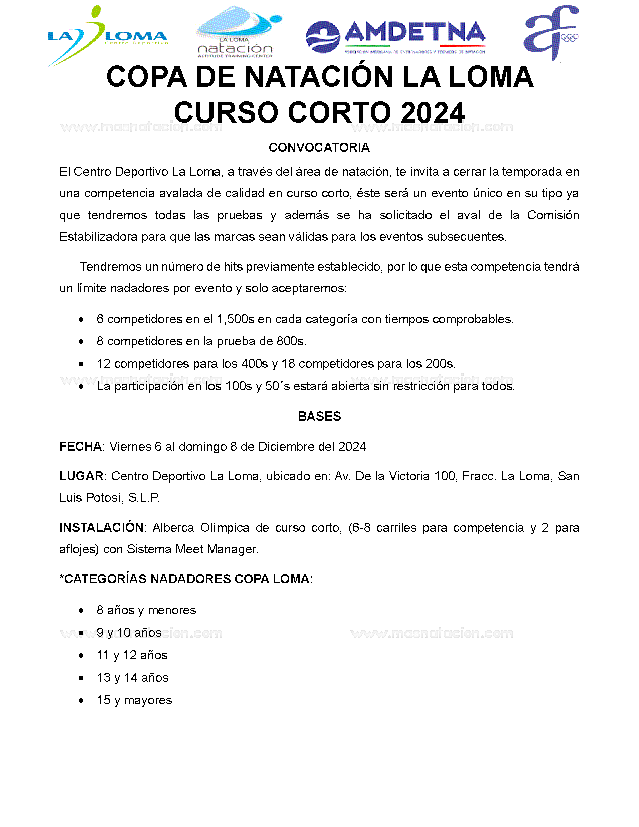 Copa de Natación la Loma Curso Corto 2024 Centro Deportivo la Loma,, San Luis Potosí, México 6 de diciembre del 2024 Convocatoria Resultados