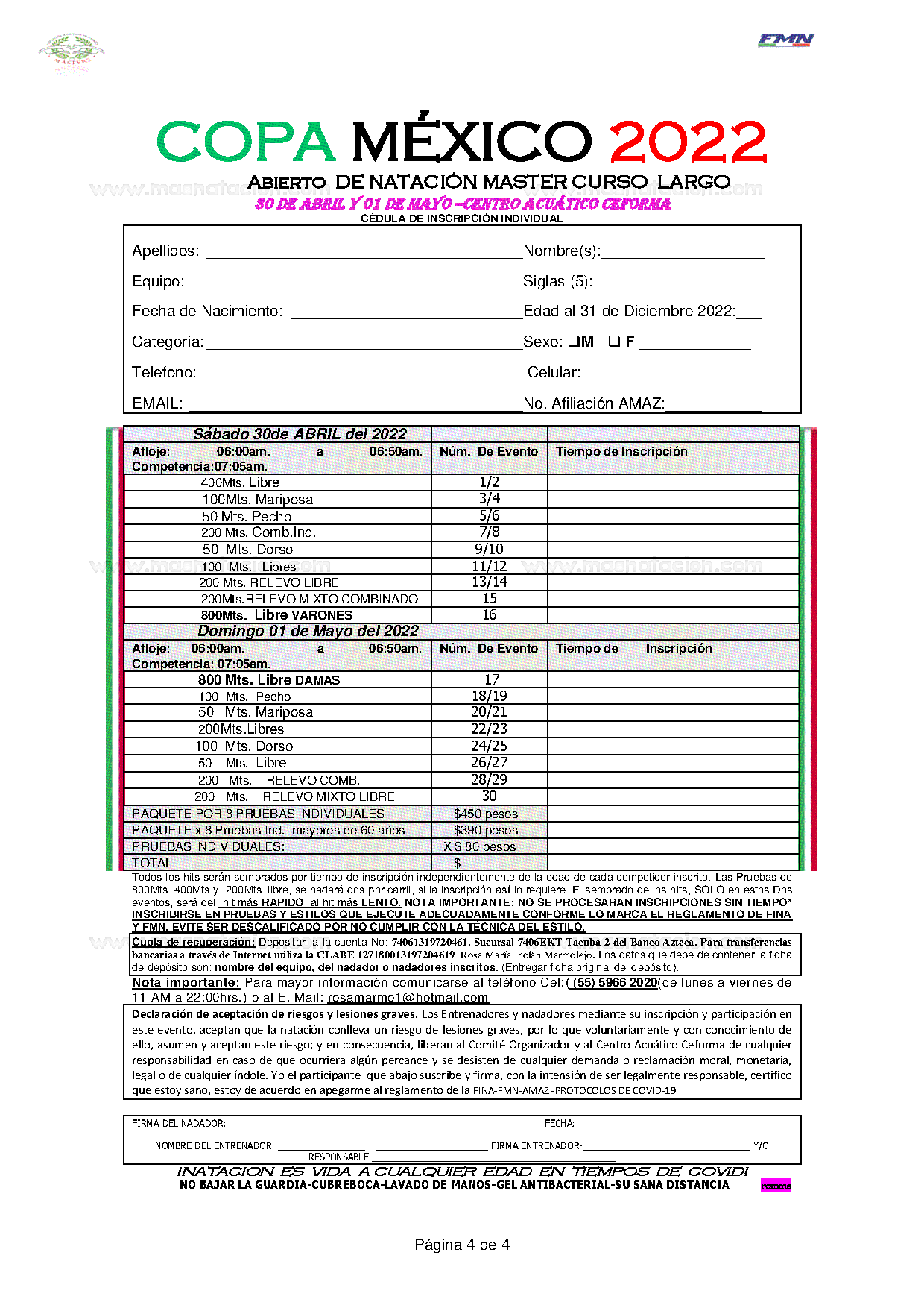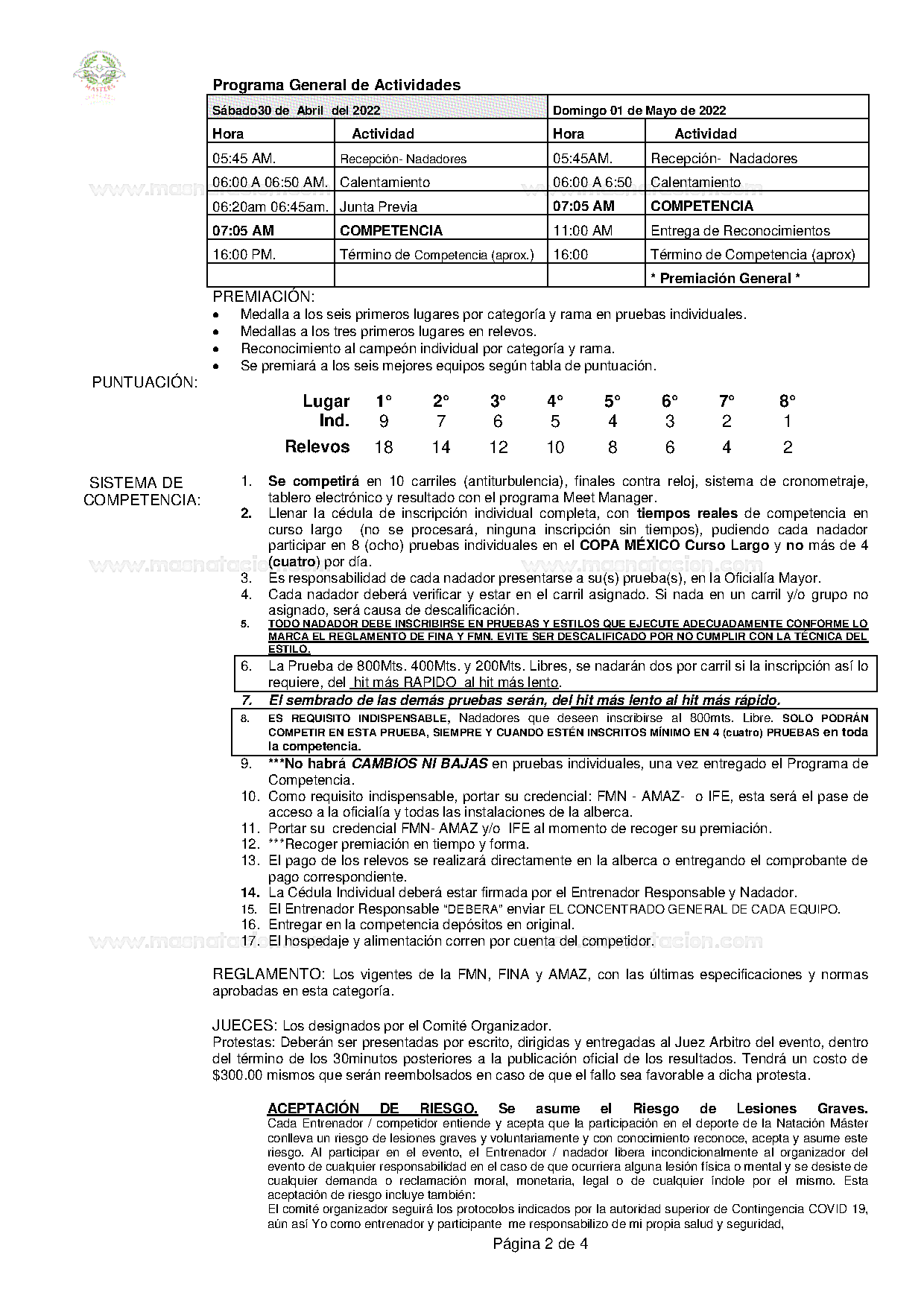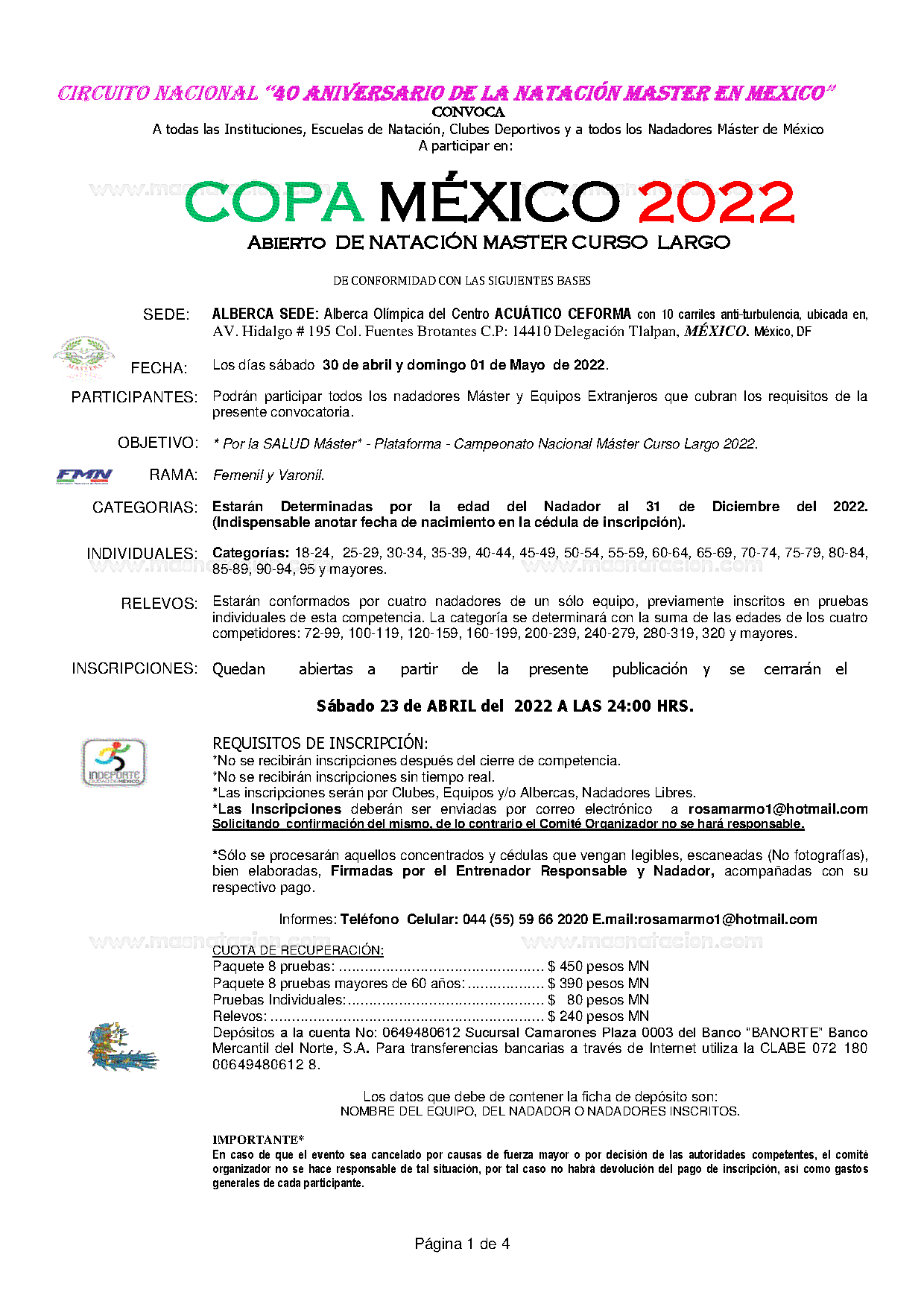 Copa México 2022 Abierto de Natación Master Curso Largo Acuático Ceforma, Ciudad de México, México 30 de abril del 2022 Convocatoria Resultados
