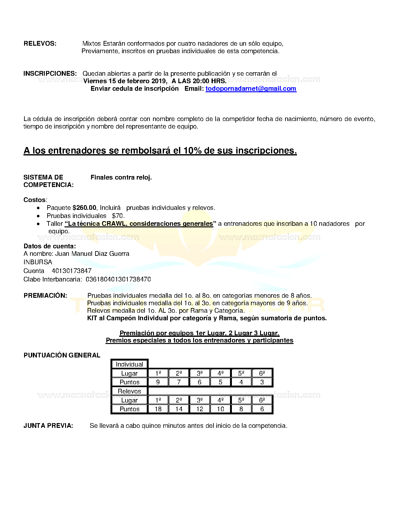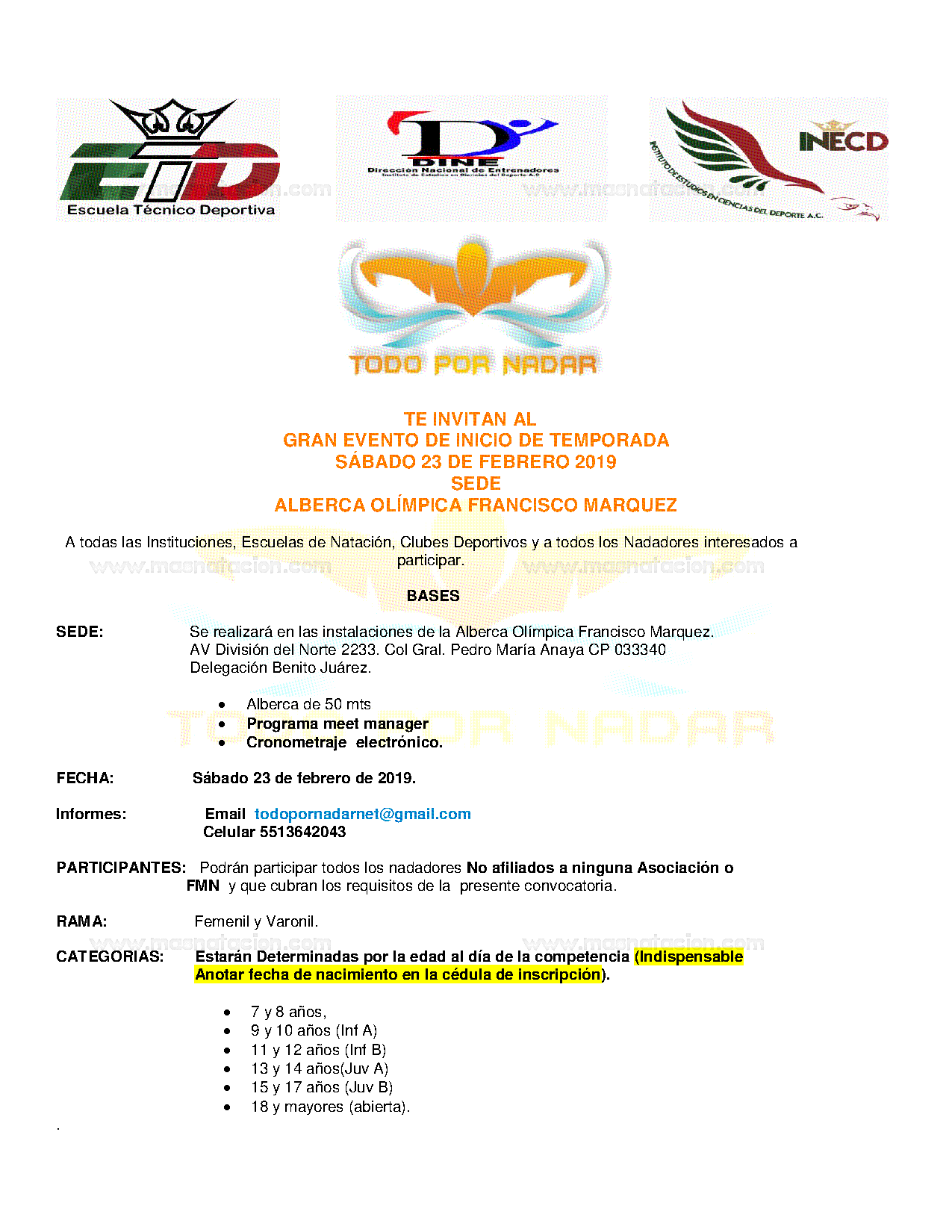 Todo Por Nadar Gran Evento de Inicio de Temporada Alberca Olímpica Francisco Marquez, Ciudad de México, México 23 de febrero del 2019 Convocatoria Resultados