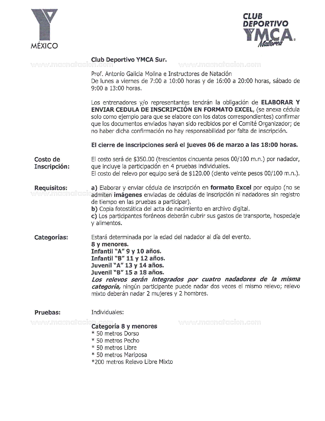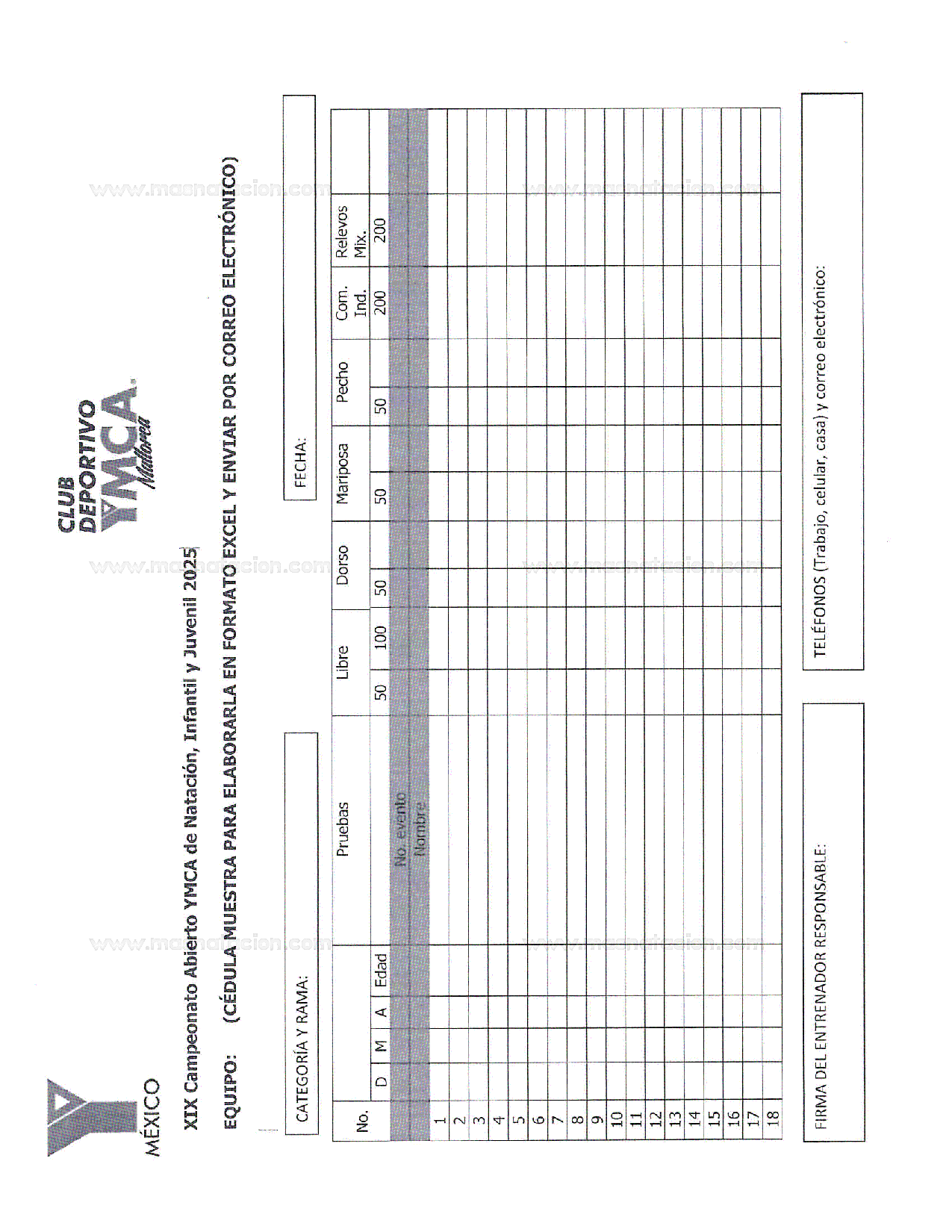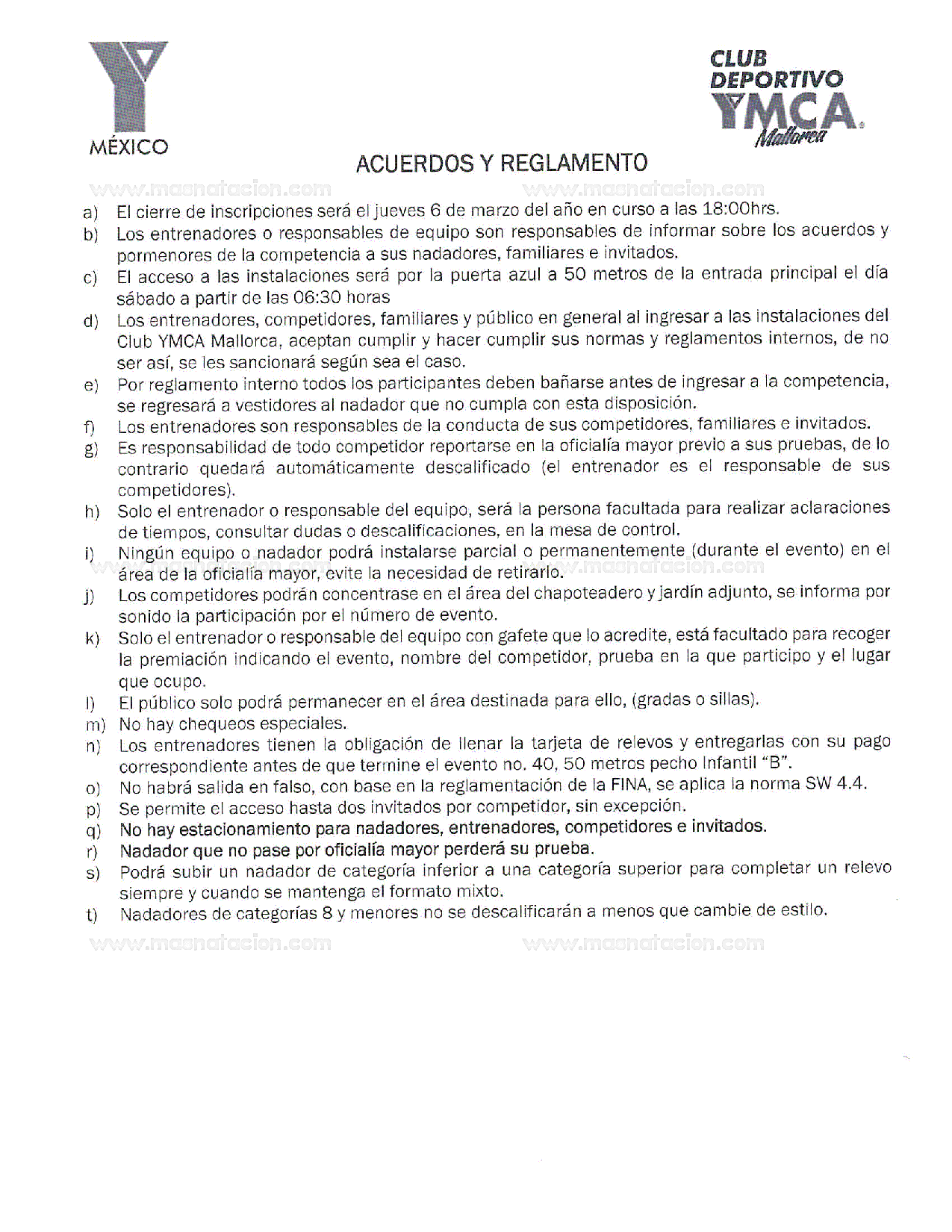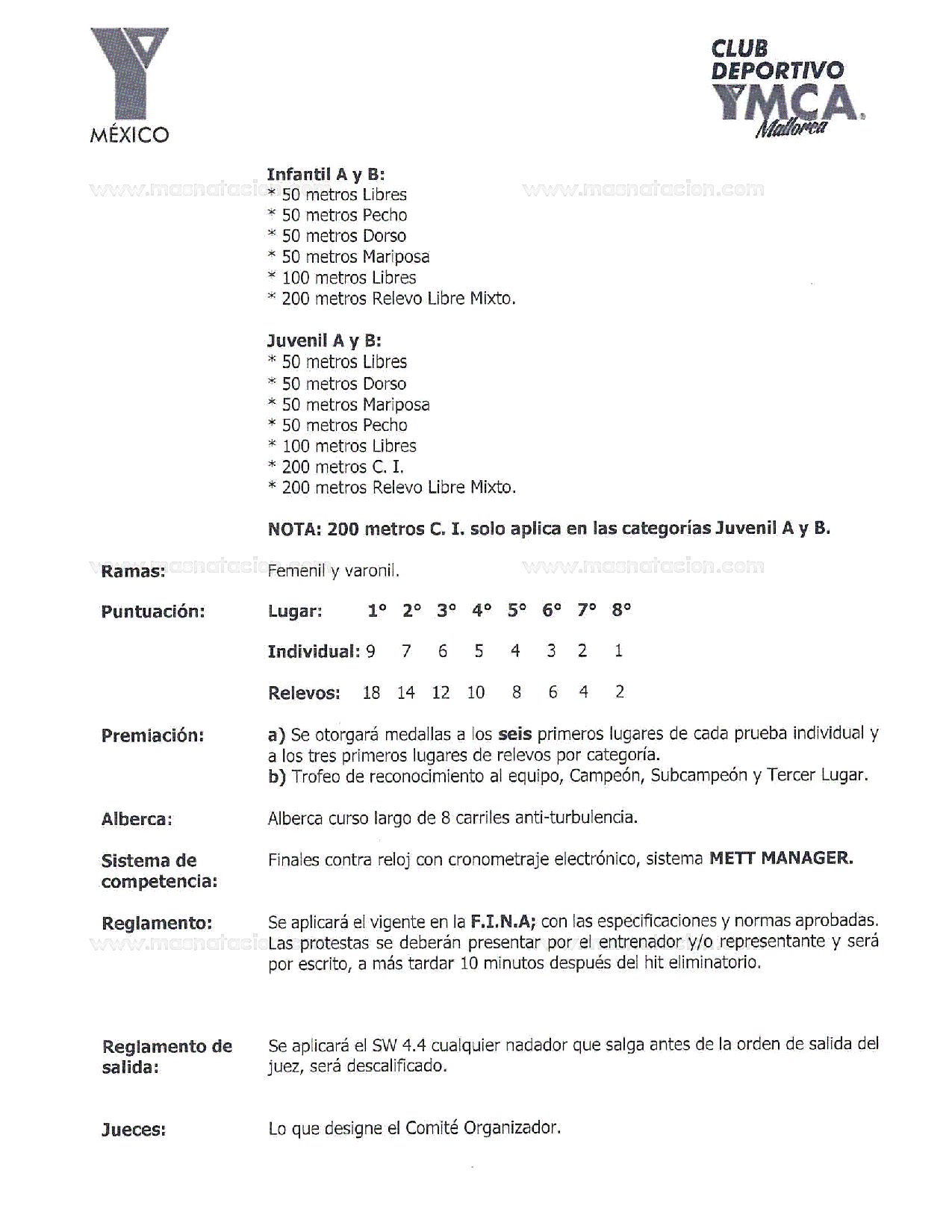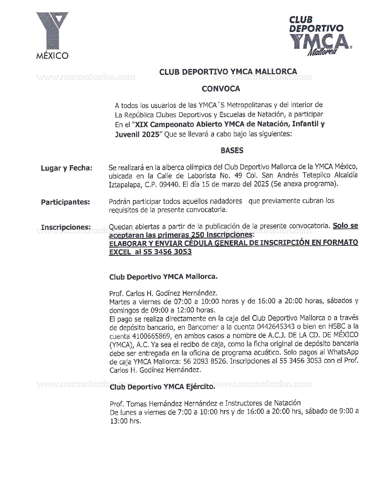 XIX Campeonato Abierto Ymca de Natación Infantil y Juvenil 2025 Ymca Mallorca, Ciudad de México, México 15 de marzo del 2025 Convocatoria Resultados