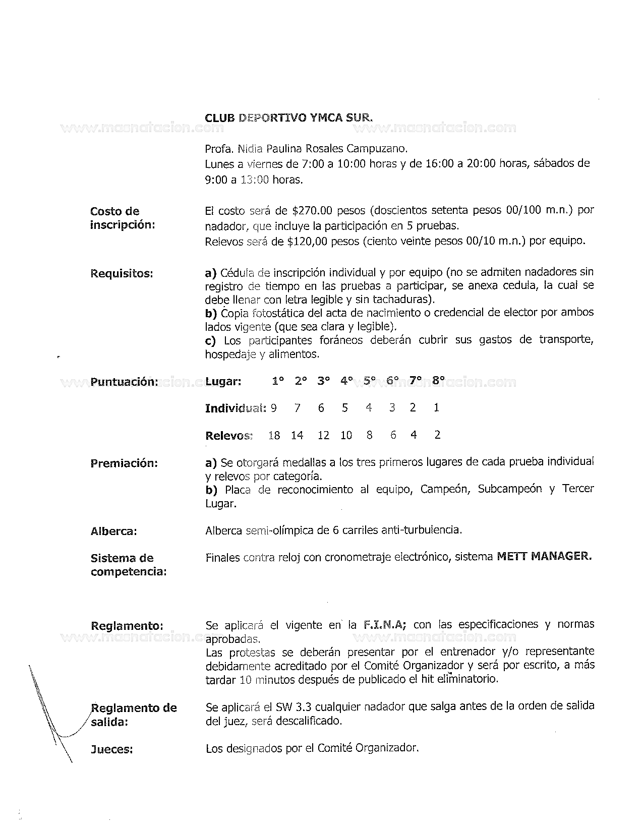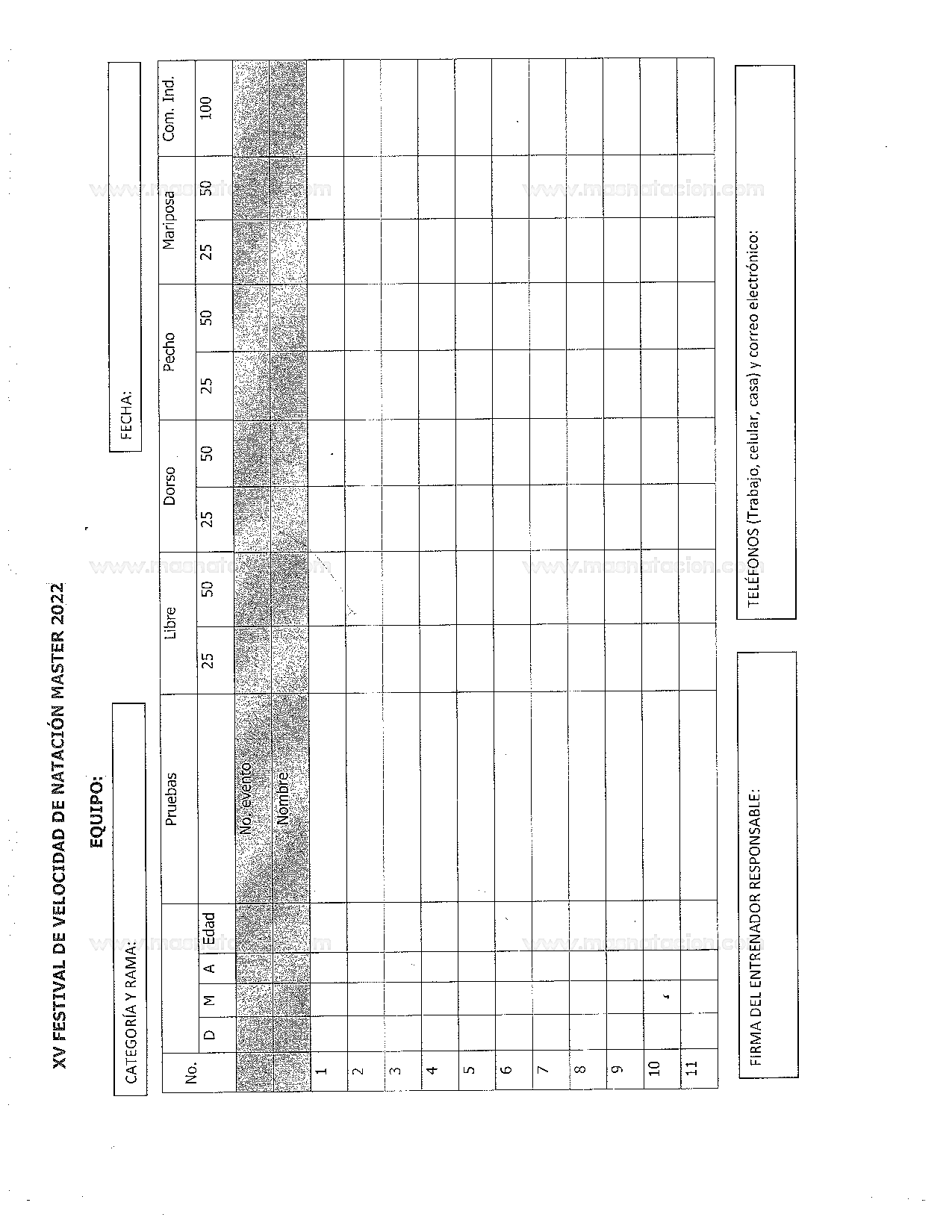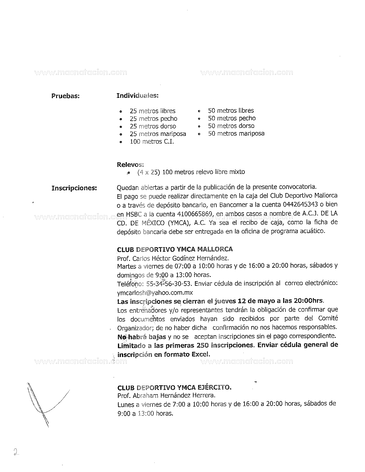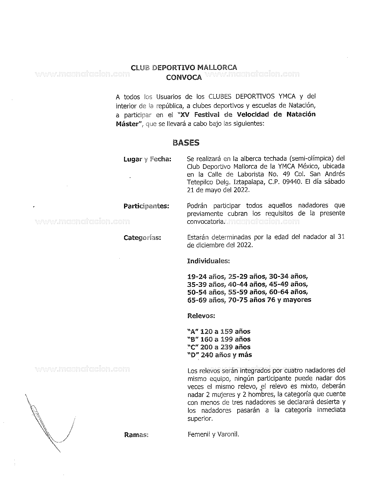 XV Festival de Velocidad de Natación Master Ymca 2022 Ymca Mallorca, Ciudad de México, México 21 de mayo del 2022 Convocatoria Resultados