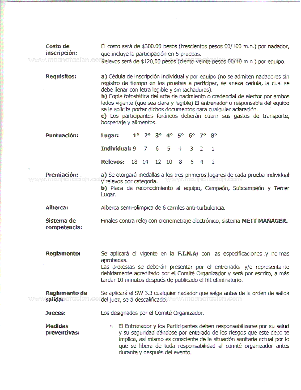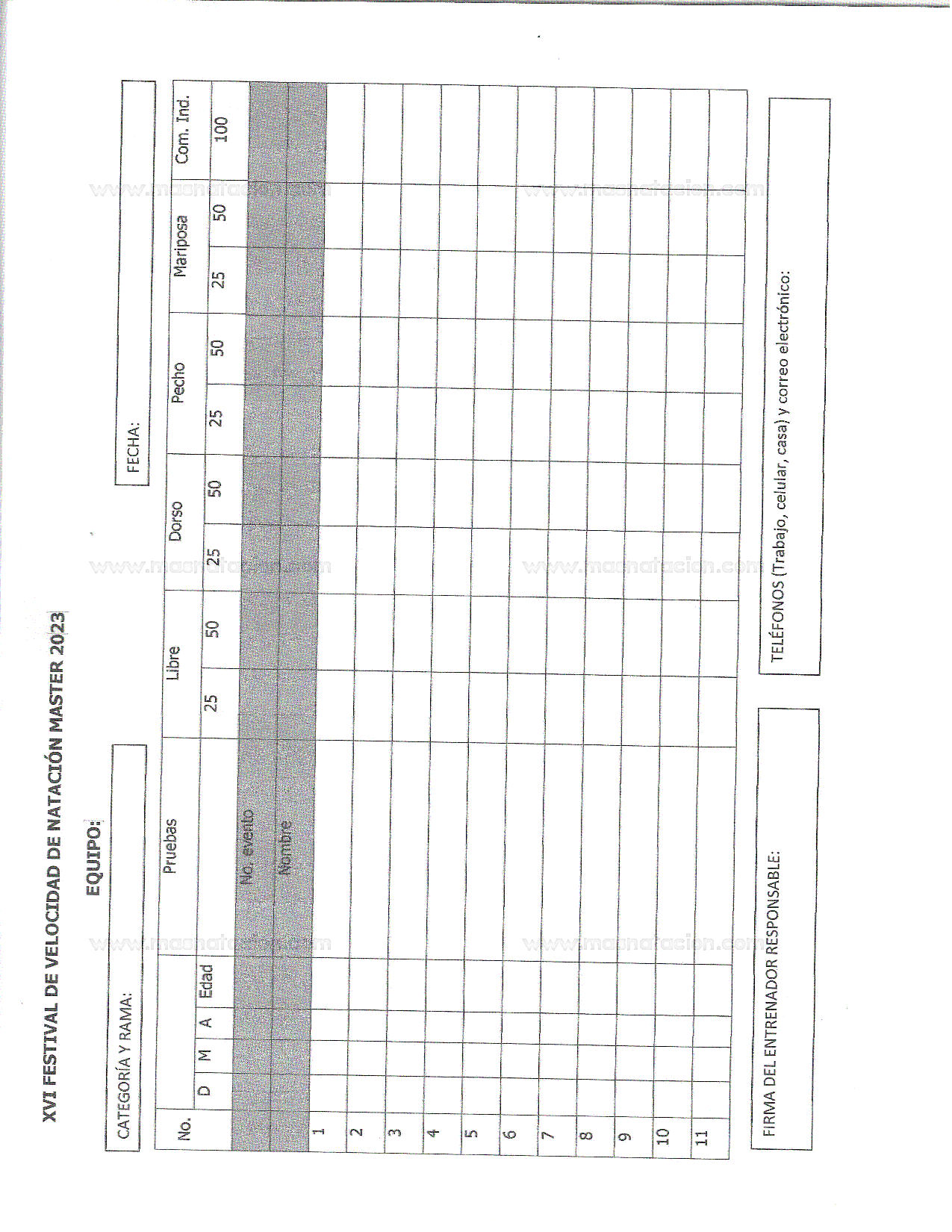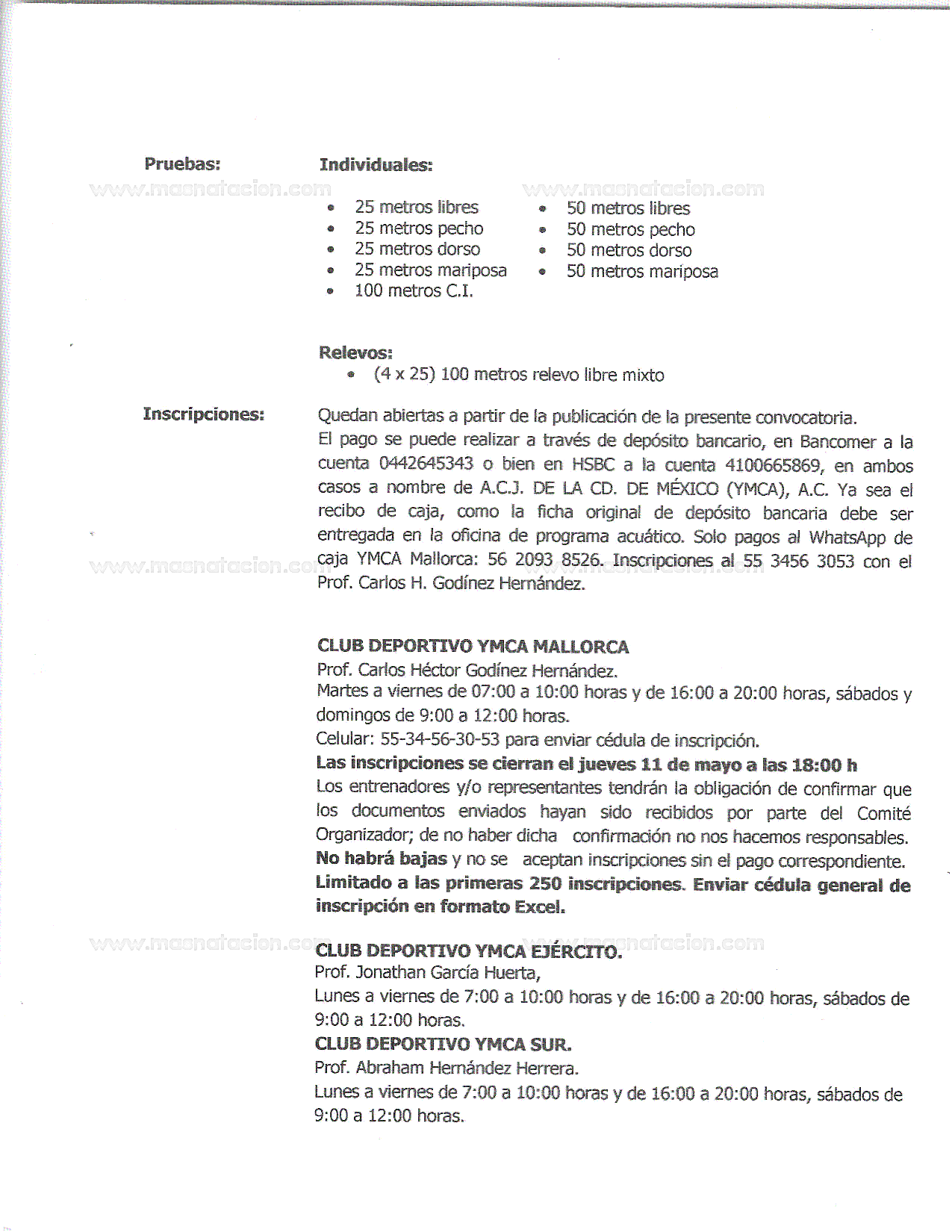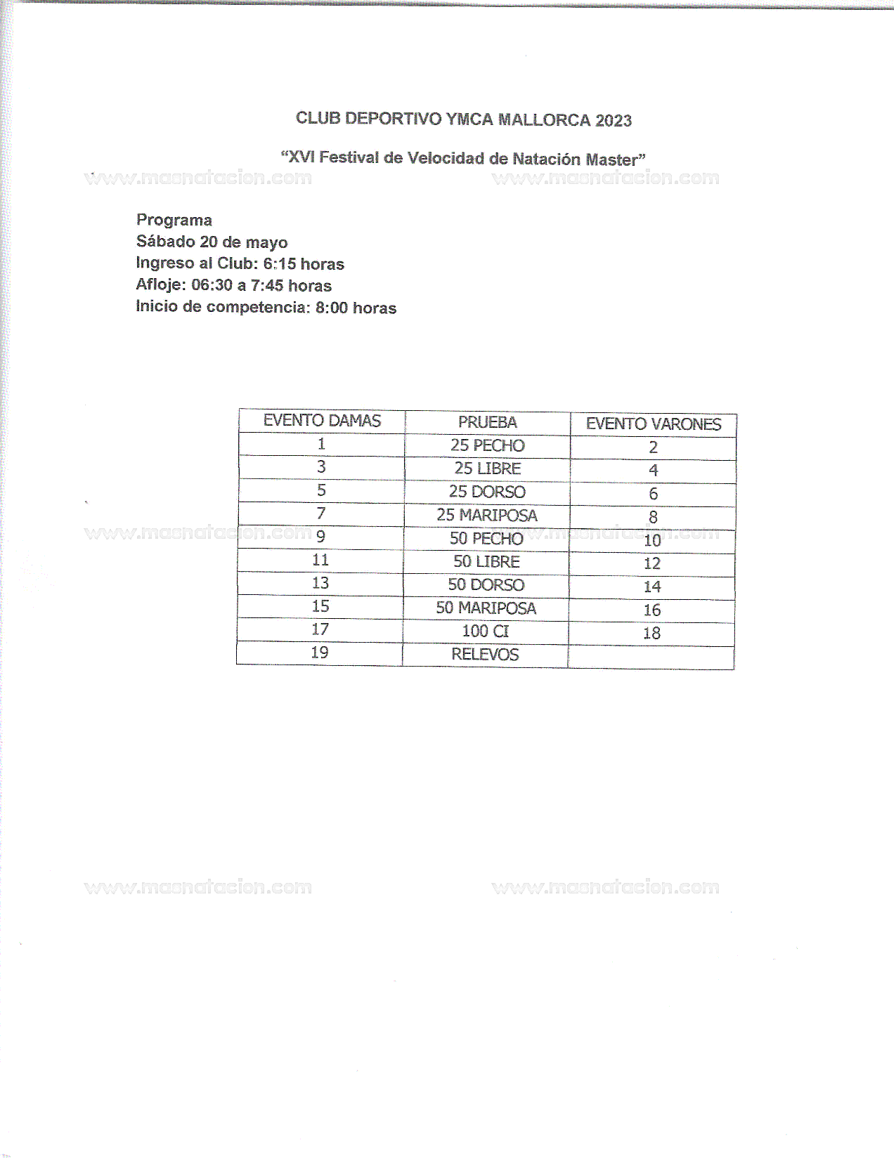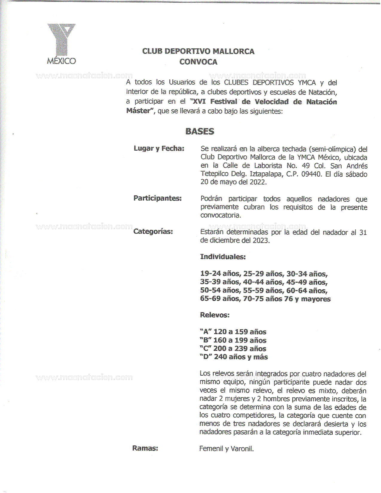 XVI Festicval de Velocidad de Natacion Master Ymca Mallorca 2023 Ymca Mallorca, Ciudad de México, México 20 de mayo del 2023 Convocatoria Resultados