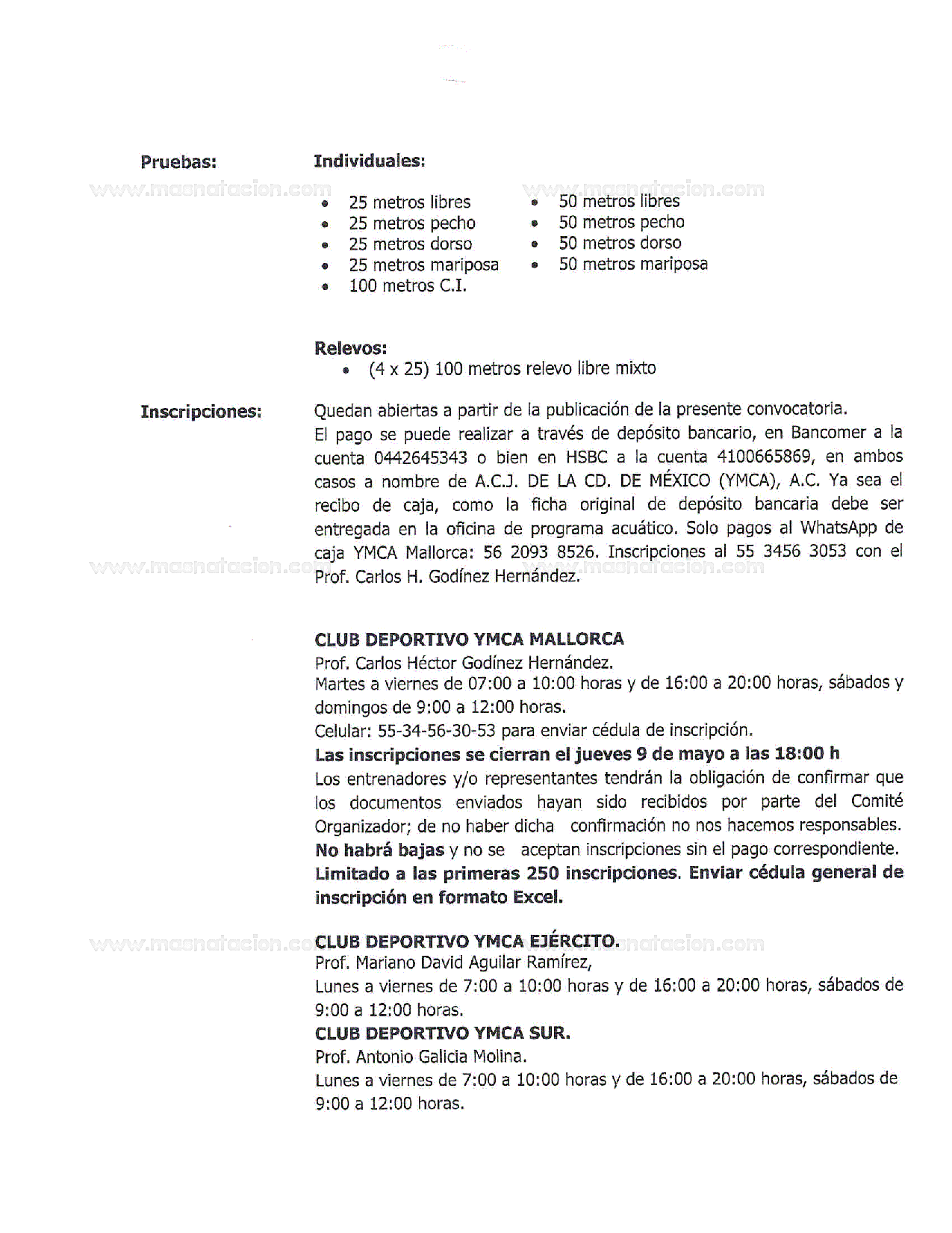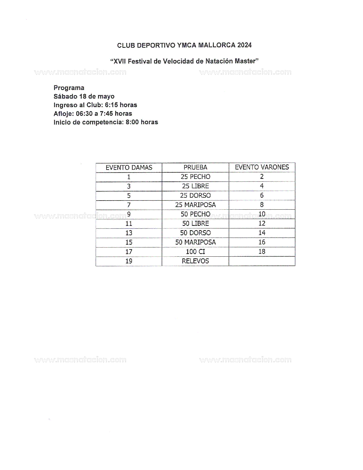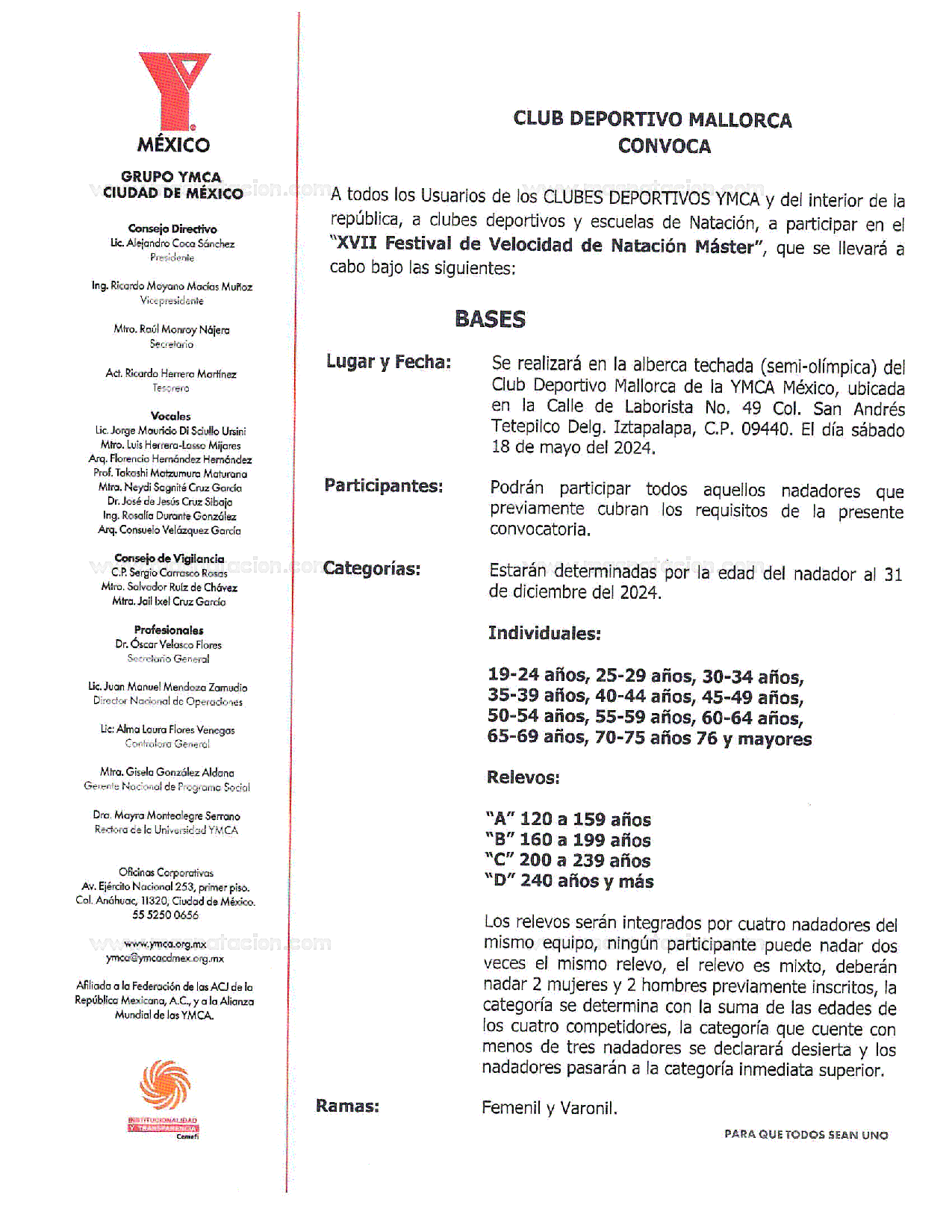 XVII Festival de Velocidad de Natacion Master Ymca 2024 Ymca Mallorca, Ciudad de México, México 18 de mayo del 2024 Convocatoria Resultados