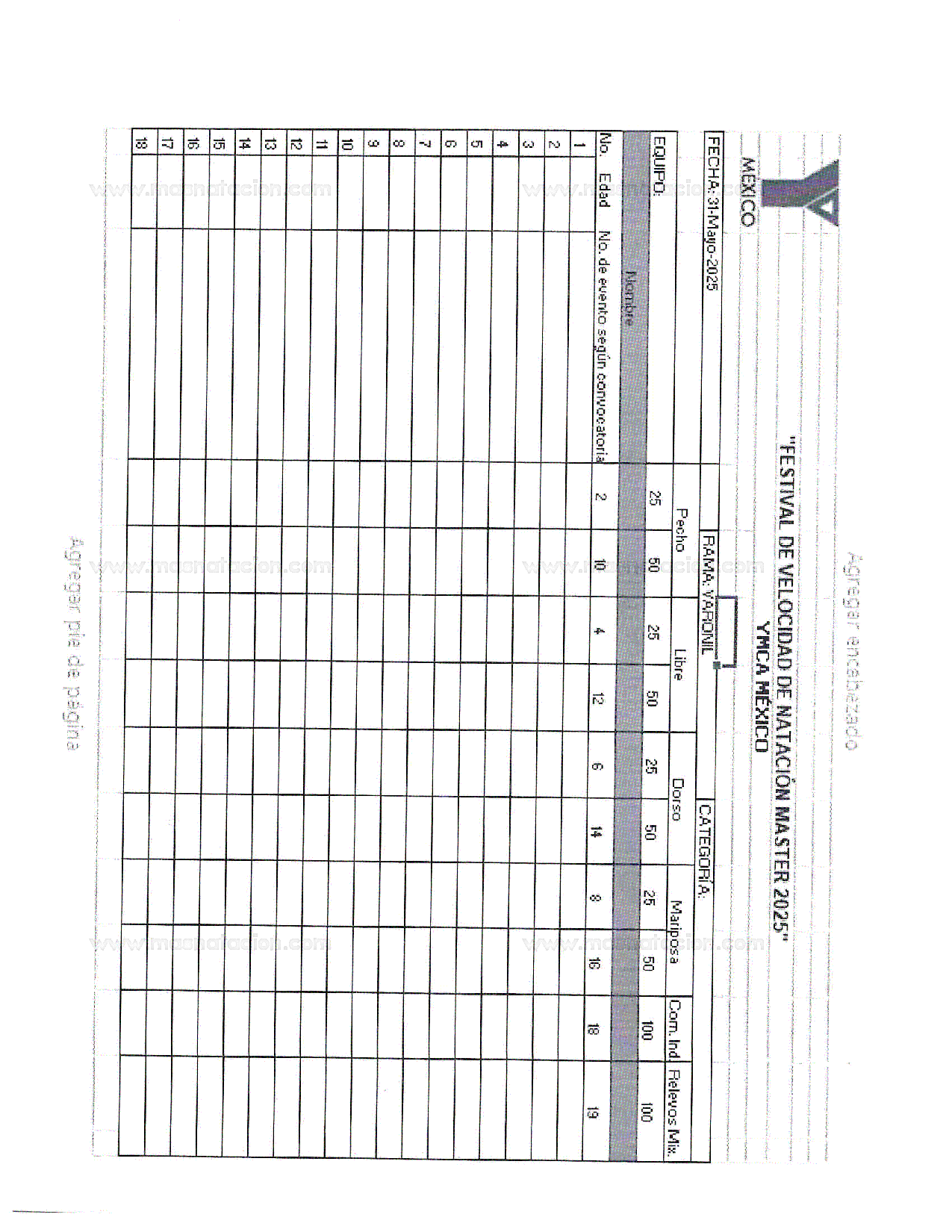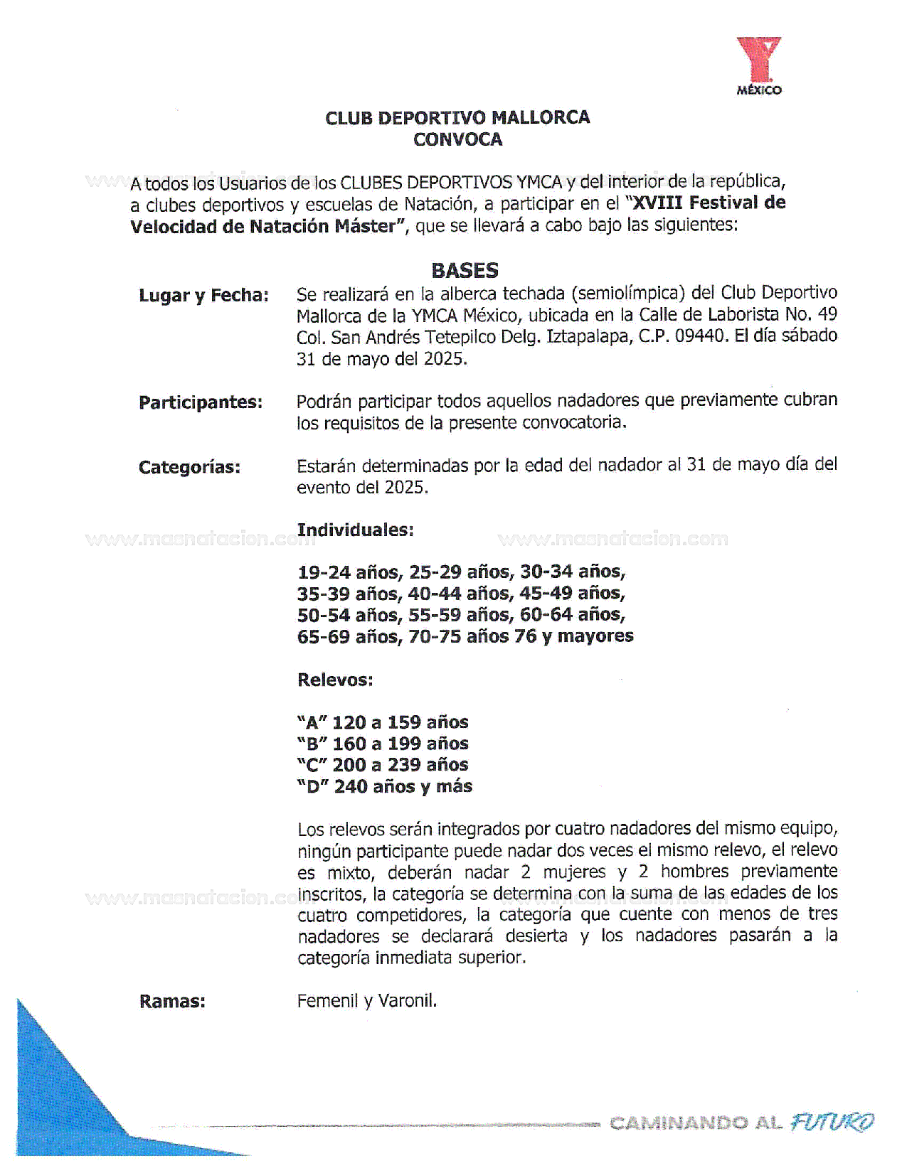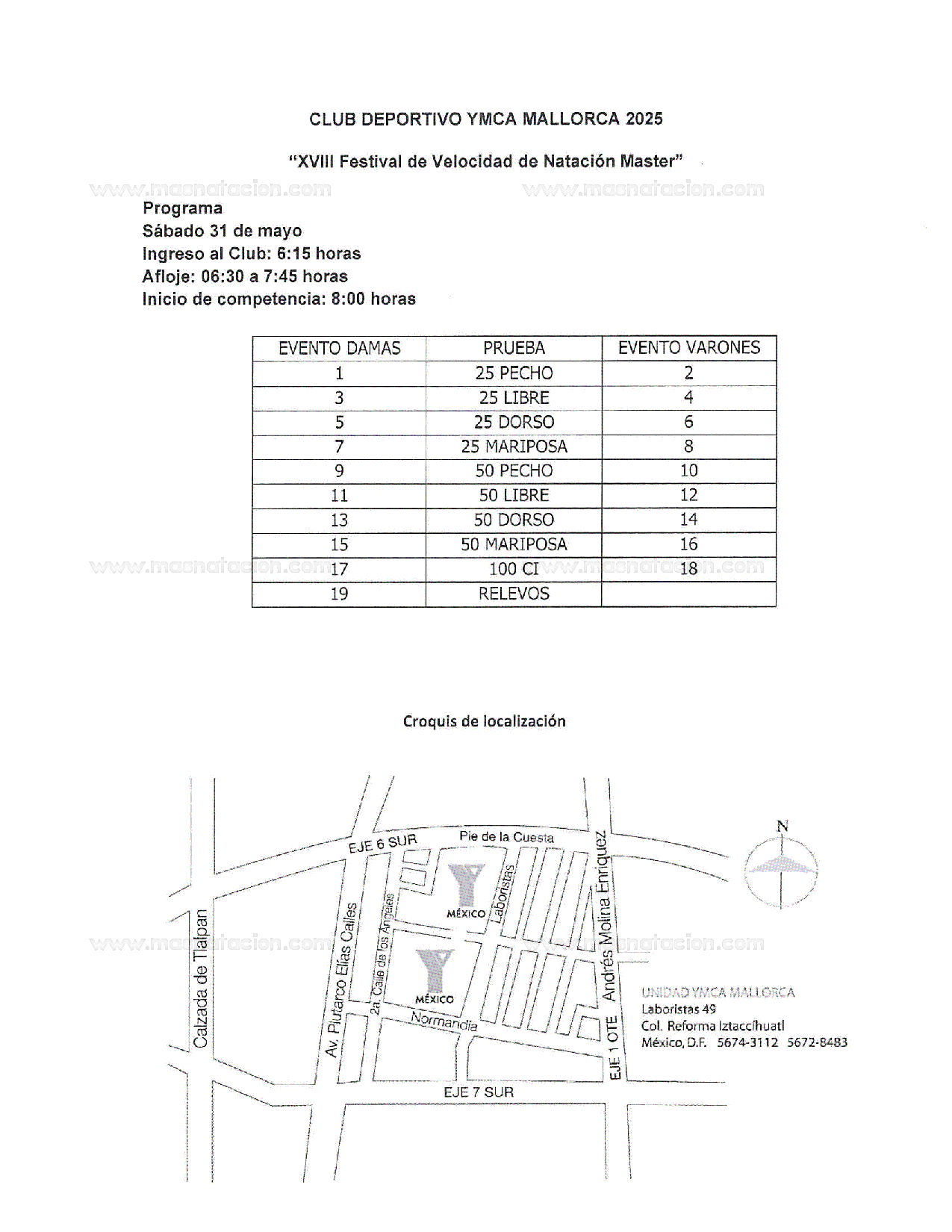 XVIII Festival de Velocidad de Natacion Master 2025 Club Deportivo Mallorca Ymca, Ciudad de México, México 31 de mayo del 2025 Convocatoria Resultados